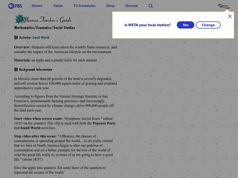 A lesson focusing on over-consumption where students are challenged to consider the impact of the American lifestyle on the environment. Using an apple as a model, this lesson offers students a visual explanation of arable land and...