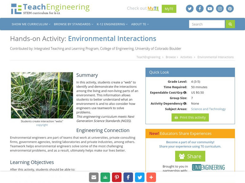 In this activity, students create a "web" to identify and demonstrate the interactions among the living and non-living parts of an environment. This information allows students to better understand what an environment is and to also...