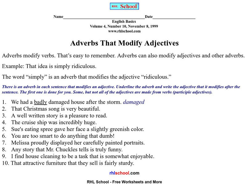 This tutorial shows how adverbs modify adjectives and other adverbs. It also has a 10-question printout quiz.
