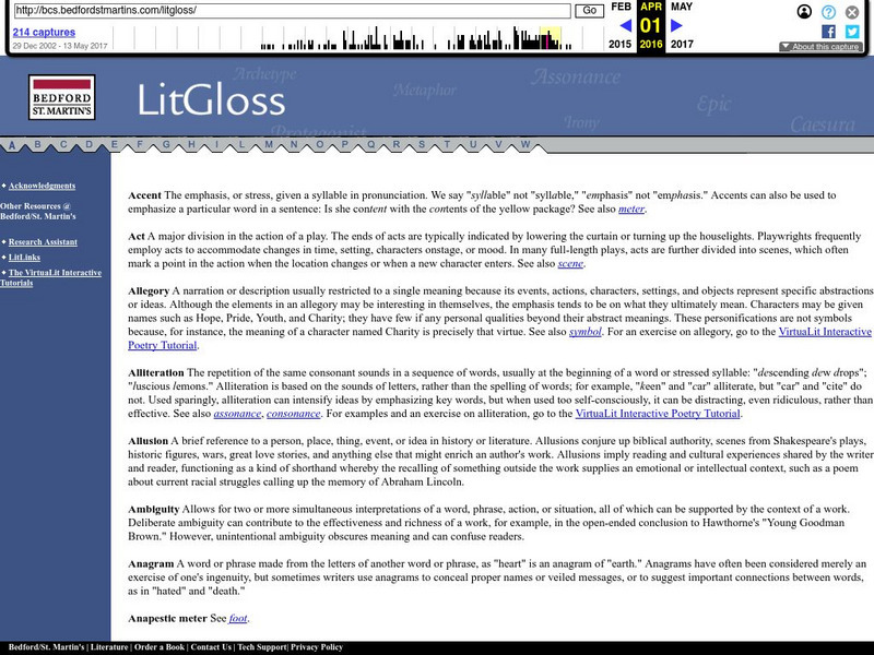 An encyclopedia of literary terms is included on this site. Students can choose different letters of the alphabet to search for literary terms.
