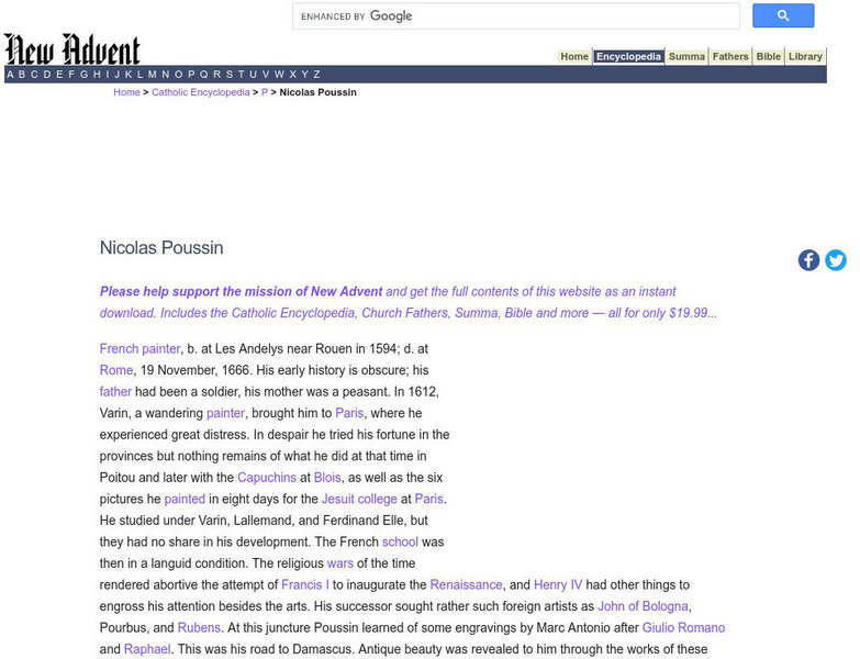 The Catholic Encyclopedia site gives you a rather extensive biography on Nicolas Poussin. Please note that ?The Catholic Encyclopedia? is a historic reference source and should be viewed in the context of resource material dated around...