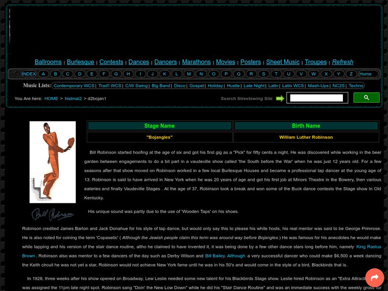 A comprehensive biography of Bill "Bojangles" Robinson. Content focuses on his successes and contributions to tap dance.