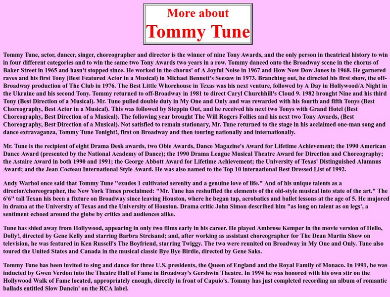 Biographical information about singer/dancer Tommy Tune, includes career highlights and award information.