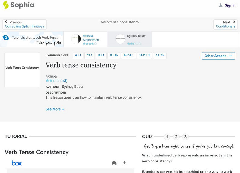 A video explaining how to maintain verb tense consistency. It is 2 of 2 in the series titled "Verb tense consistency" and is followed by a three-question multiple choice quiz. [7:25]