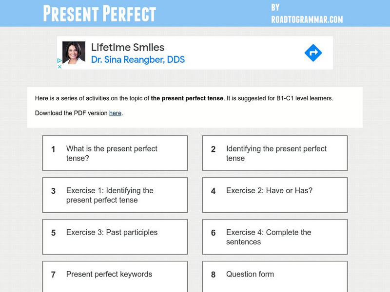 A learning module with eighteen different links to information, exercises, and questions on present perfect tense.