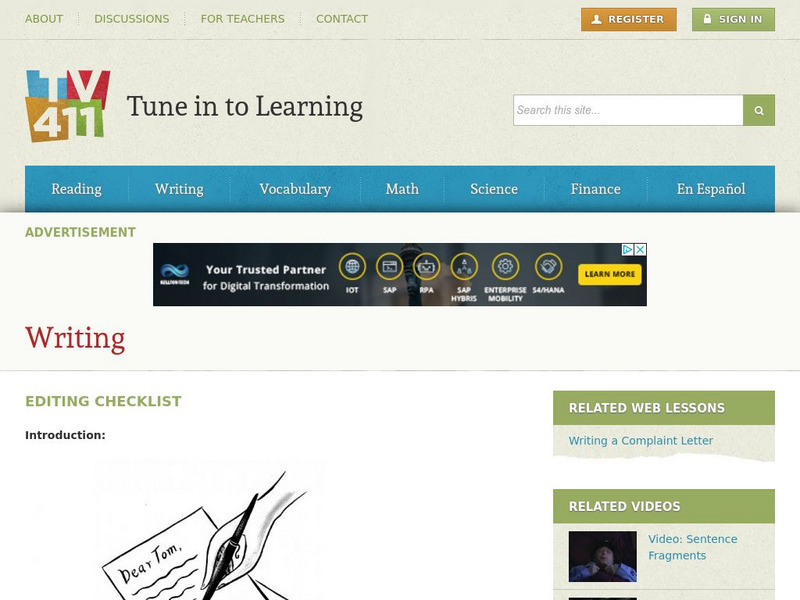 An editing/proofreading checklist is often helpful when you read your own work, or someone else's. This site helps you edit for capitalization, sentence fragments, verb tense, and punctuation. Included is a brief video about sentence...