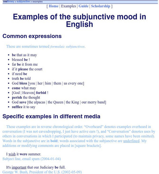 A good list of examples of how the subjunctive mood is used. Note: There is a section at the bottom entitled "Where is the Subjunctive?" that gives examples of conversation overheard where the subjunctive mood was not used (and it should...