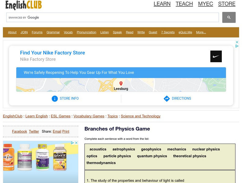 Choose from a word bank to complete ten sentences about the various branches of physics. Hints are available if needed, and a percentage score is displayed once answers are submitted.