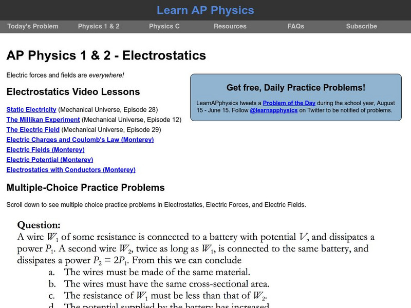 A site dedicated to help students prepare for the AP Physics B test. This specific site reviews electrostatics including electric charges, Coulomb's law, static electricity, electric fields, electric potential, and electrostatic...