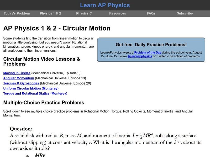 A site dedicated to help students prepare for the AP Physics B test. This specific site reviews circular motion including uniform circular motion, torque, rotational statics, gyroscopes, moment of inertia, and static equilibrium. Site...