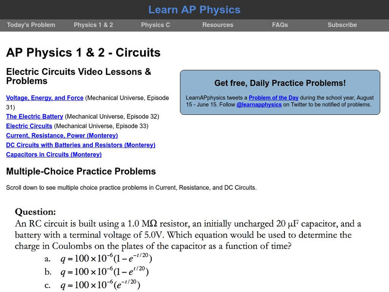A site dedicated to help students prepare for the AP Physics B test. This specific site reviews circuits including current, resistance, power, Ohm's law, batteries, DC circuits, transformers, and car coils. Site contains links to video...