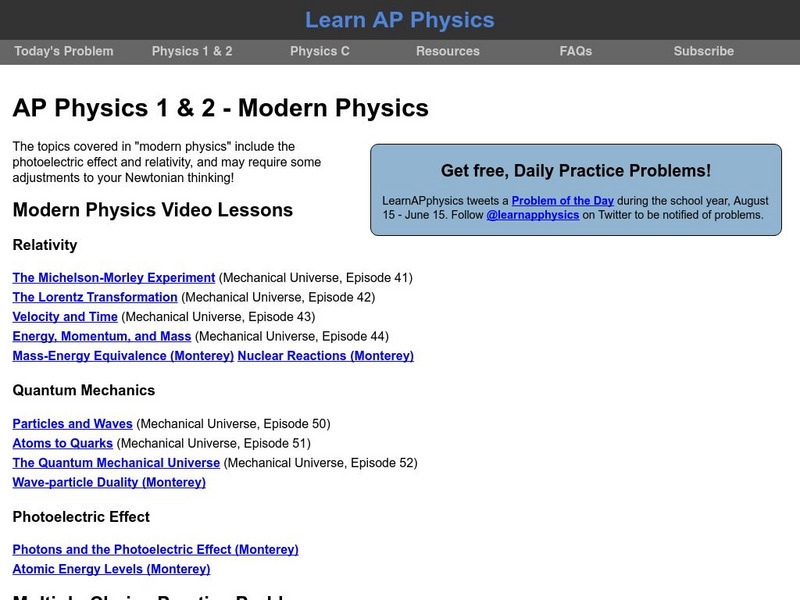A site dedicated to help students prepare for the AP Physics B test. This specific site reviews Modern Physics including photons, photoelectric effect, atomic energy levels, The Michelson-Morley experiment, The Lorentz Transformation,...