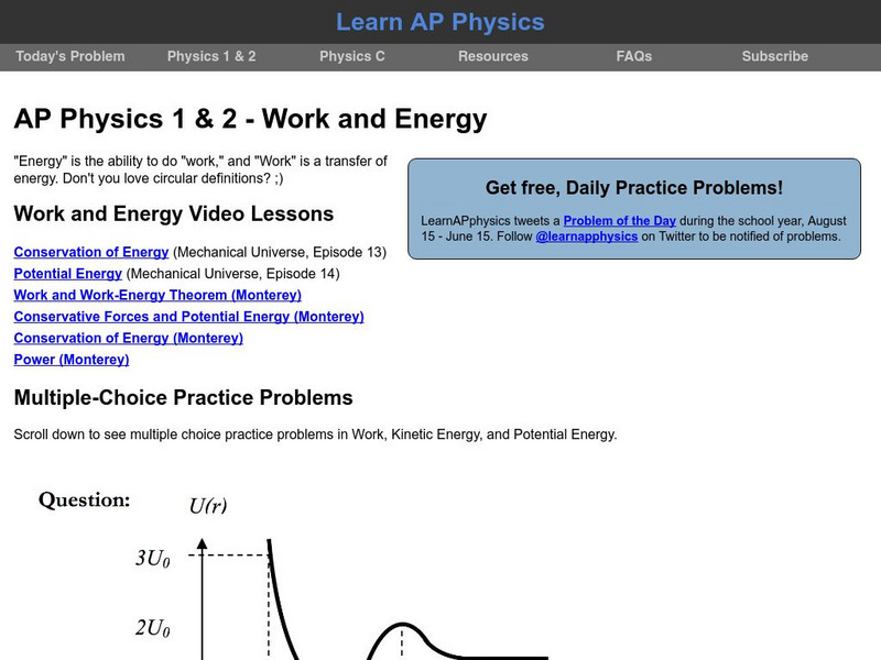 A site dedicated to help students prepare for the AP Physics B test. This specific site reviews work and energy including work-energy theorem, conservation of energy, potential energy and power. Site contains links to video lectures and...