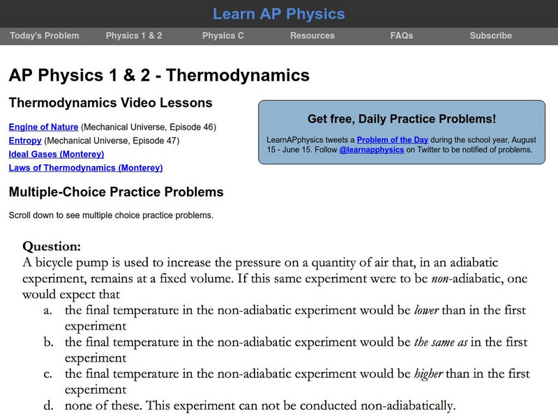A site dedicated to help students prepare for the AP Physics B test. This specific site reviews thermodynamics including ideal gases, laws of thermodynamics, and entropy. Site contains links to video lectures and practice problems.