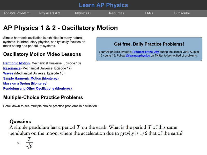 A site dedicated to help students prepare for the AP Physics B test. This specific site reviews oscillatory motion including simple harmonic motion, Hooke's law, harmonic motion, pendulum, and springs. Site contains links to video...