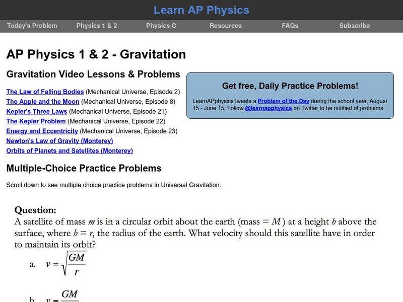 A site dedicated to help students prepare for the AP Physics B test. This specific site reviews gravitation including Newton's Law of Gravity, orbits of planets and satellites, and Kepler's three laws. Site contains links to video...