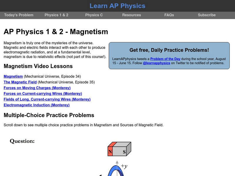 A site dedicated to help students prepare for the AP Physics B test. This specific site reviews magnetism including the magnetic field, magnetic field, forces on a moving charge, forces on current-carrying wires, and electromagnetic...