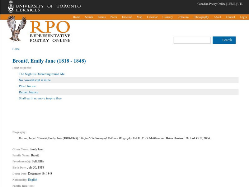 This site contains the full text for four of Emily Bronte's poems: "The Night Is Darkening Round Me," "No Coward Soul Is Mine," "Plead for Me," and "Remembrance."