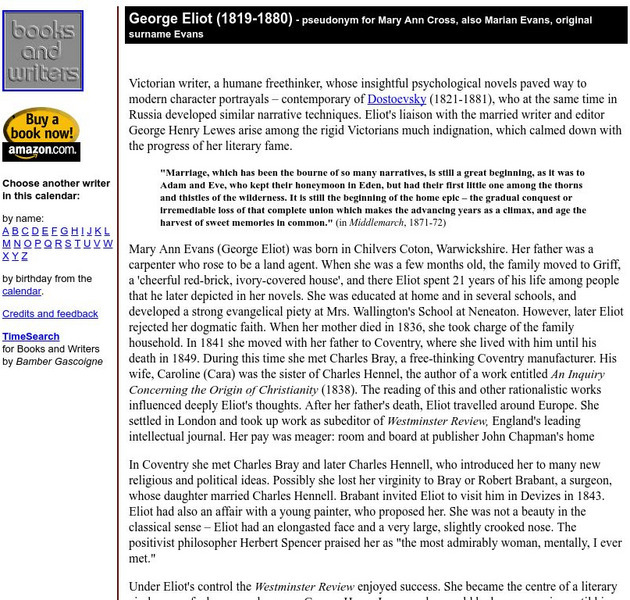 Read about Mary Ann Cross -- better known as George Eliot -- who was the author of "Middlemarch" and "Silas Marner." This page includes biographical information as well as insight into individual literary works by Eliot.