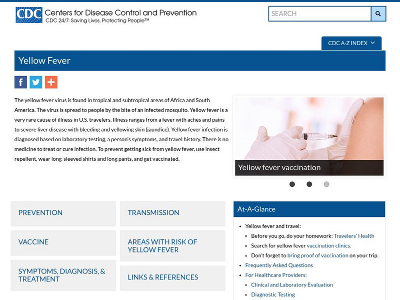 This site from the Centers for Disease Control and Prevention has information on yellow fever. The site is broken into the following sections: Yellow Fever Disease, Yellow Fever Vaccine Requirements, Yellow Fever Precautions, and Risk...