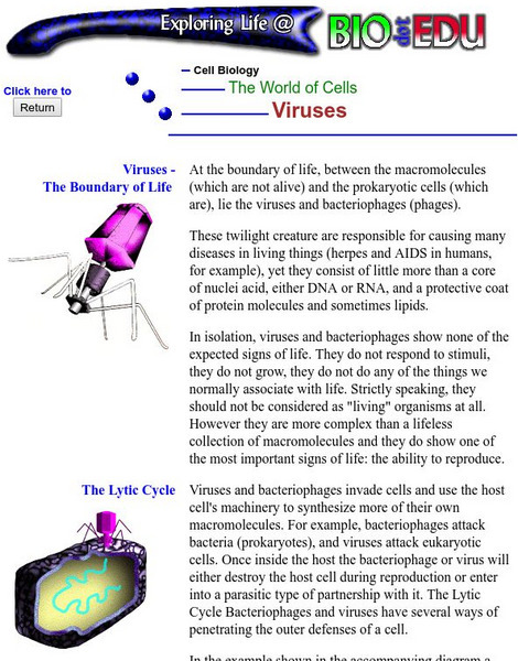 A brief overview of viruses from the University of California. Discusses the difference between the lysogenic phase and the lytic phase, gives examples of viral diseases, and provides information on the relationship between viruses and...
