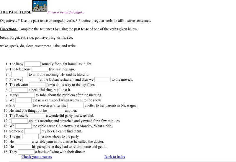A quiz on using the past tense of irregular verbs is found at this site. Eighteen questions to challenge your knowledge. When finished, check your answers by clicking "Check Your Answers" at the bottom of the page.