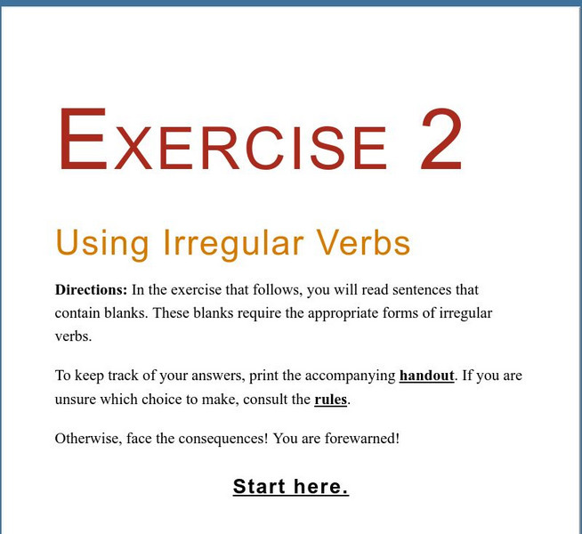 Exercise 3. This exercise tests your knowledge of irregular verbs. A link to the rules for using irregular verbs is included--and explanations are given for each answer. Fun feedback.