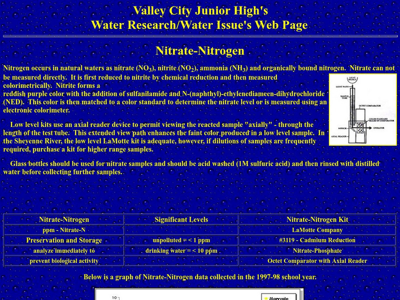 This site talks about the nitrate and nitrogen forms that can be found and how to test for it. Includes illustrative diagrams and graphs.