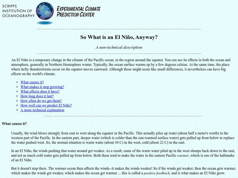 This page has links to the causes of El Nino, a non-technical definition of El Nino, causes, and tons of other information.
