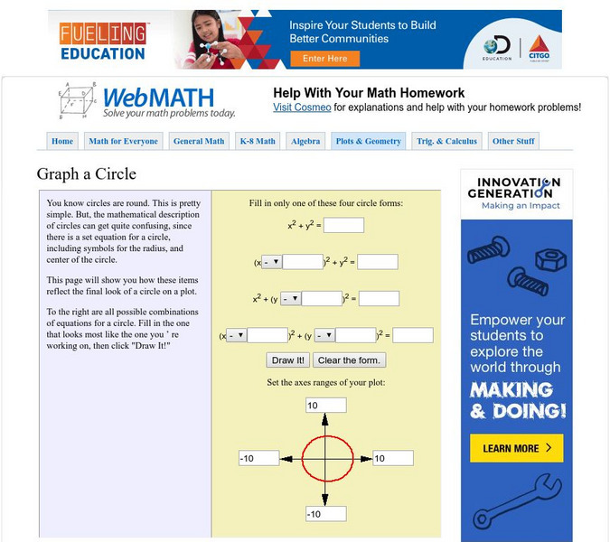 WebMath offers a java applet that allows you to input information about a circle, in one of four forms, and gives you the graph of the circle.
