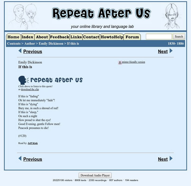 A poem from Emily Dickinson, "If This Is", is provided on this site. Students may listen to this poem read aloud by Jeff Kiok and can access a printable version of this piece.