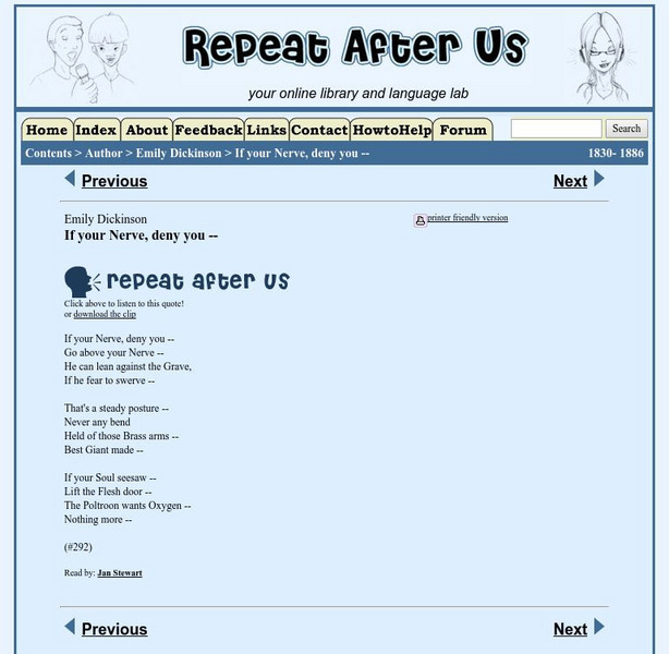 A poem from Emily Dickinson, "If Your Nerve, Deny You--", is provided on this site. Students may listen to this poem read aloud by Jan Stewart and can access a printable version of this piece.