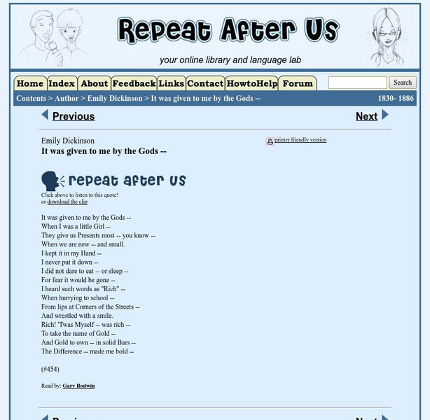 A poem from Emily Dickinson, "It Was Given to Me by the Gods --", is provided on this site. Students may listen to this poem read aloud by Gary Bodwin and can access a printable version of this piece.