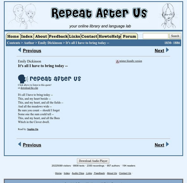 A poem from Emily Dickinson, "It's All I Have to Bring Today --", is provided on this site. Students may listen to this poem read aloud by Sophia On and can access a printable version of this piece.