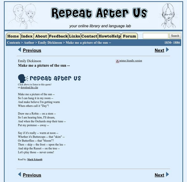 A poem from Emily Dickinson, "Make Me a Picture of the Sun --", is provided on this site. Students may listen to this poem read aloud by Mark Eckardt and can access a printable version of this piece.