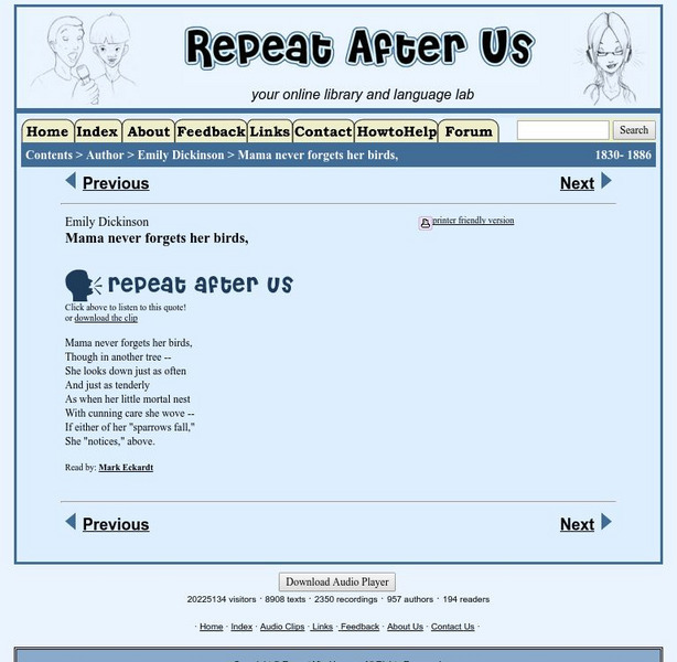 A poem from Emily Dickinson, "Mama Never Forgets Her Birds", is provided on this site. Students may listen to this poem read aloud by Mark Eckardt and can access a printable version of this piece.