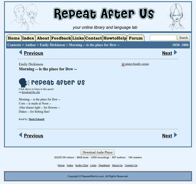 A poem from Emily Dickinson, "Morning--Is the Place for Dew--", is provided on this site. Students may listen to this poem read aloud by Mark Eckardt and can access a printable version of this piece.