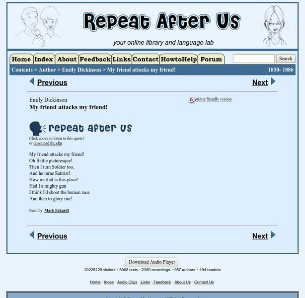 A poem from Emily Dickinson, "My Friend Attacks My Friend!", is provided on this site. Students may listen to this poem read aloud by Mark Eckardt and can access a printable version of this piece.
