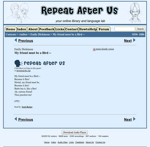 A poem from Emily Dickinson, "My Friend Must be a Bird--", is provided on this site. Students may listen to this poem read aloud by Scott Becker and can access a printable version of this piece.
