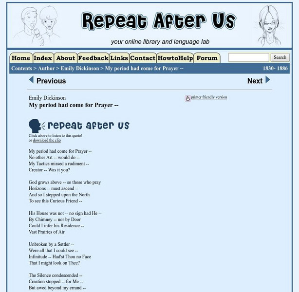 A poem from Emily Dickinson, "My Period Had Come for Prayer--", is provided on this site. Students may listen to this poem read aloud by Gary Bodwin and can access a printable version of this piece.