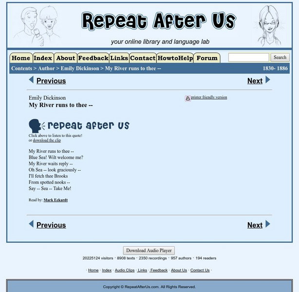 A poem from Emily Dickinson, "My River Runs to Thee--", is provided on this site. Students may listen to this poem read aloud by Mark Eckardt and can access a printable version of this piece.