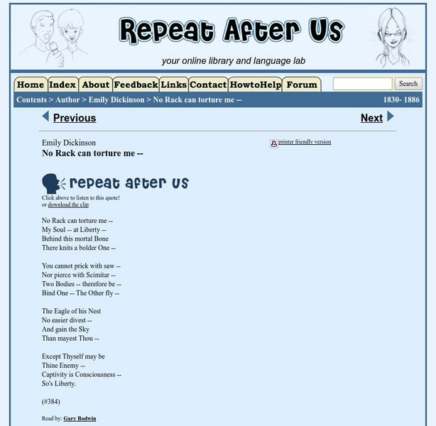 A poem from Emily Dickinson, "No Rack Can Torture Me", is provided on this site. Students may listen to this poem read aloud by Gary Bodwin and can access a printable version of this piece.