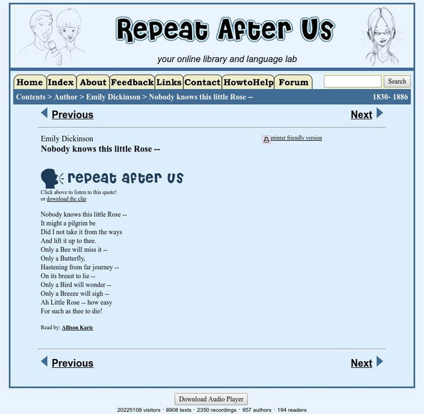A poem from Emily Dickinson, "Nobody Knows This Little Rose --", is provided on this site. Students may listen to this poem read aloud by Allison Karic and can access a printable version of this piece.