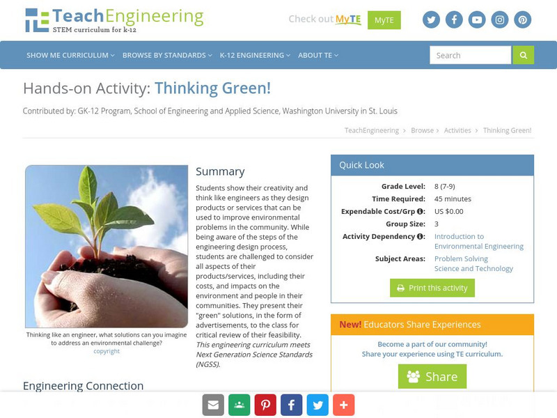 Students show their creativity and think like engineers as they design products or services that can be used to improve environmental problems in the community. While being aware of the steps of the engineering design process, students...