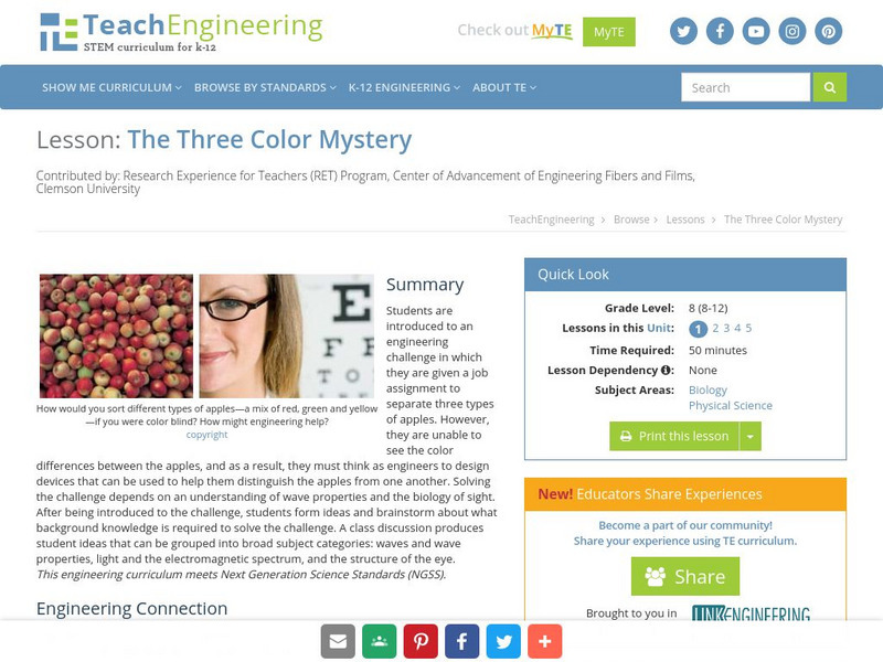 Learners are introduced to an engineering challenge in which they are given a job assignment to separate three types of apples. However, they are unable to see the color differences between the apples, and as a result, they must think as...
