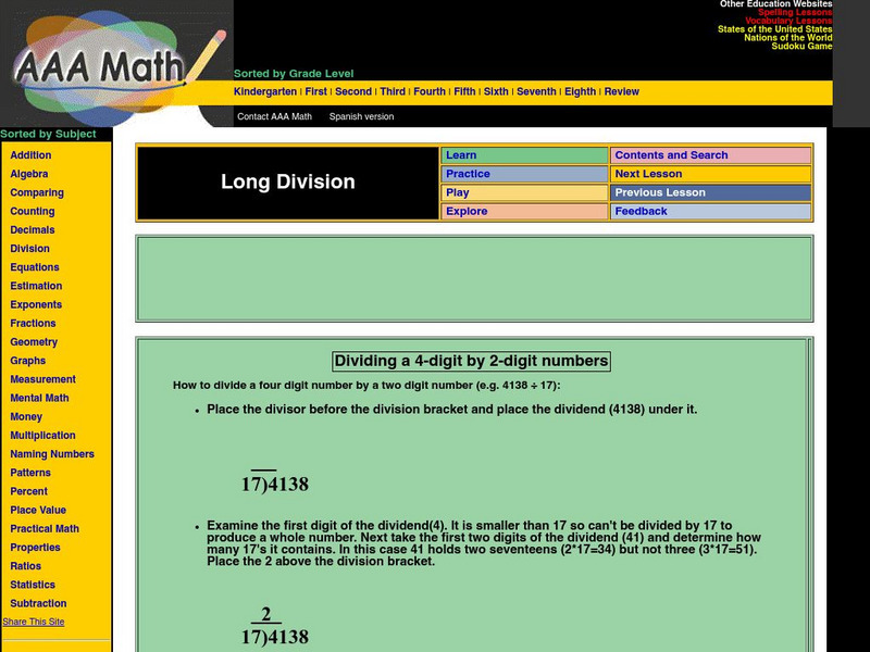 This site explains how to divide whole numbers, then offers problems and games to practice this skill.