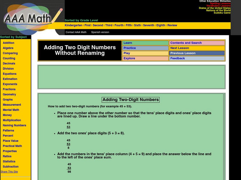 This site explains how to mentally add two-digit numbers. Gives exercises and games to practice this skill.