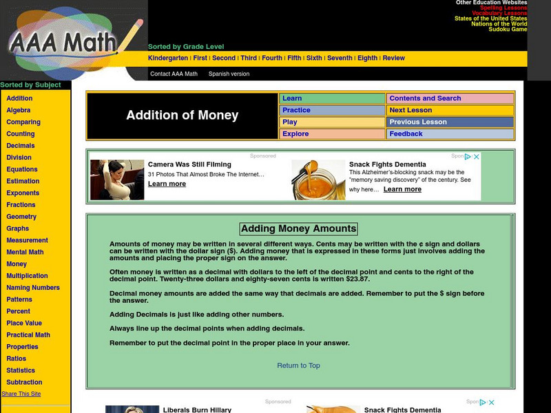 Practice your 3 and 4 addition facts using this online game from AAAMath.com. Running totals of correct and incorrect answers, as well as a percent score of your correct answers are shown to you while you play.