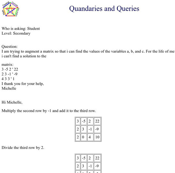 University of Regina: Math Central: Augmented Matrix Tutorial