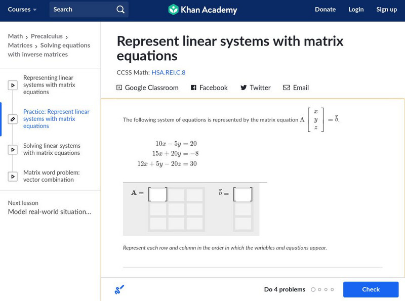 Khan Academy: Represent Linear Systems With Matrix Equations